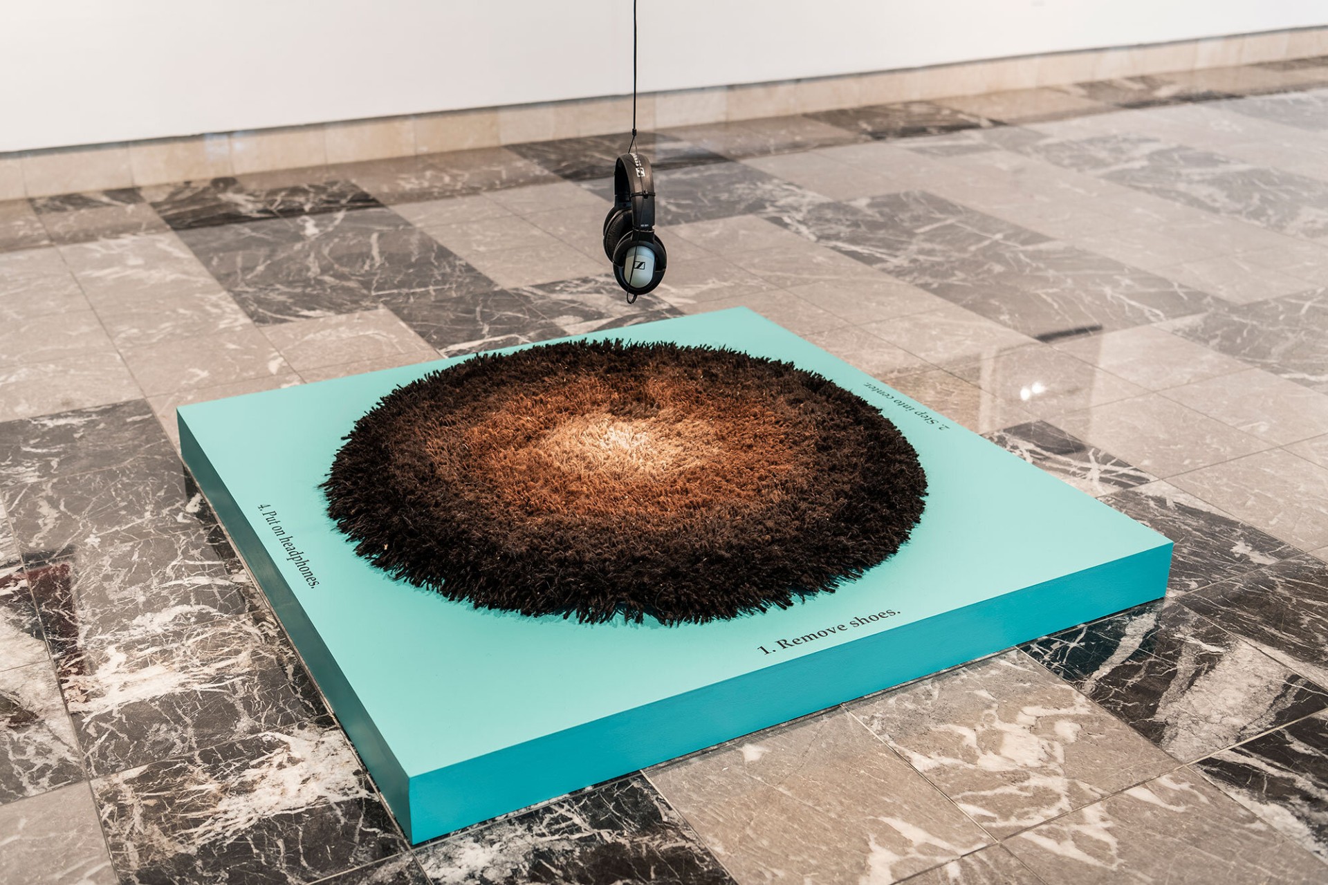 Lumen, Laura Splan, 2019, rug made with hand spun laboratory llama and alpaca wool / laboratory soundscape on headphones. Photo Courtesy of Esther Klein Gallery.